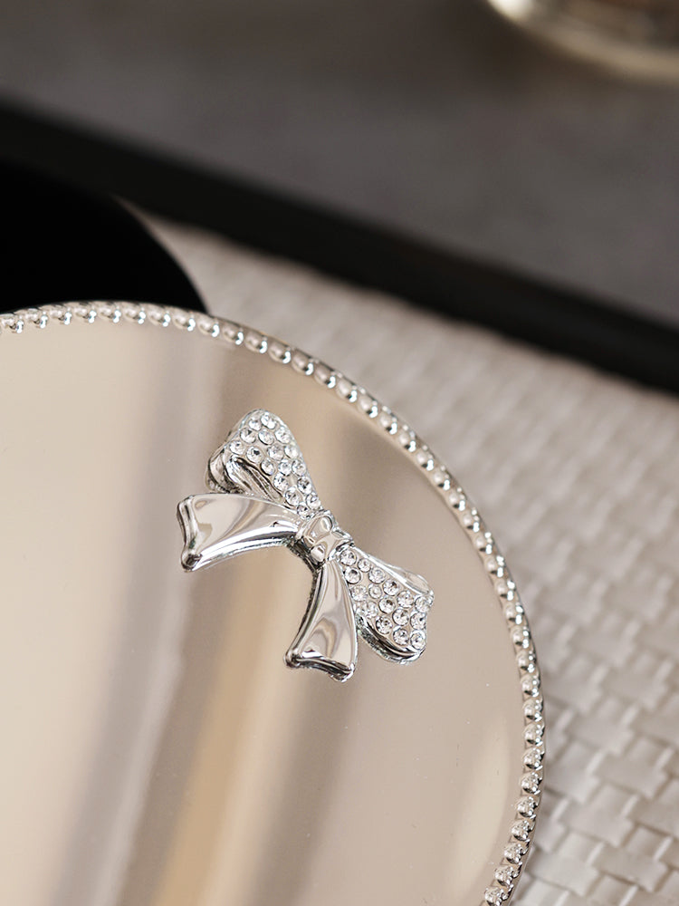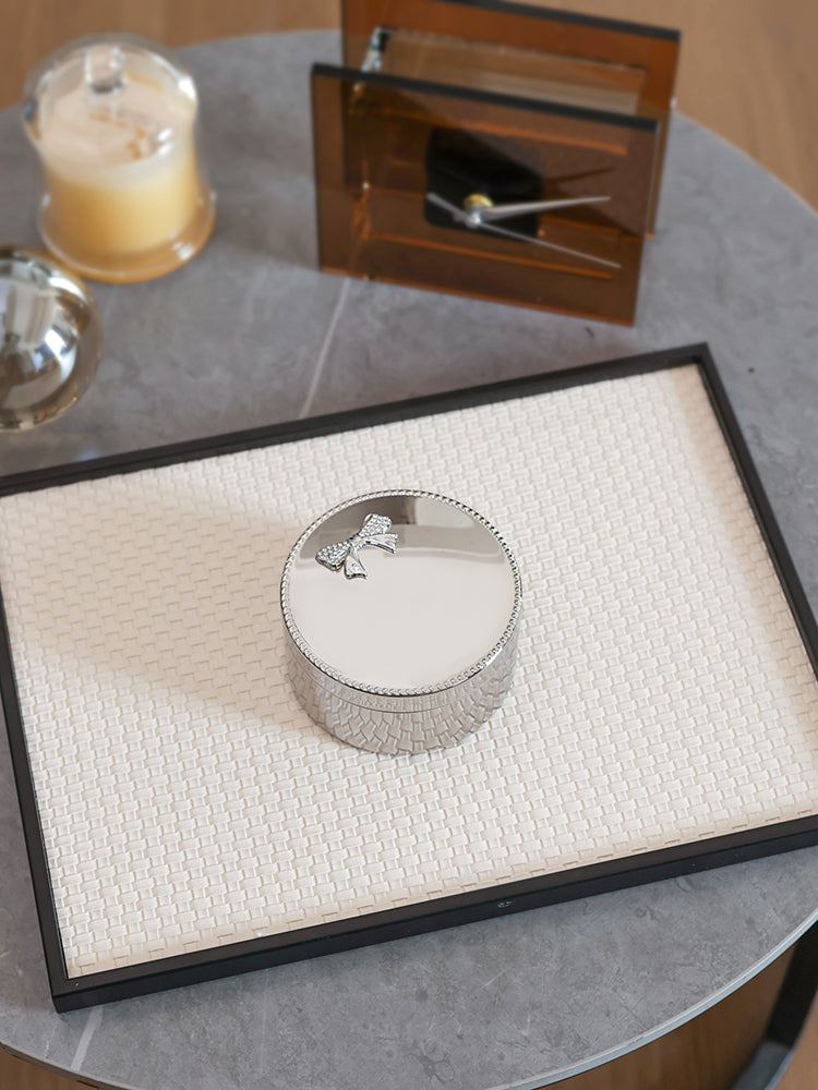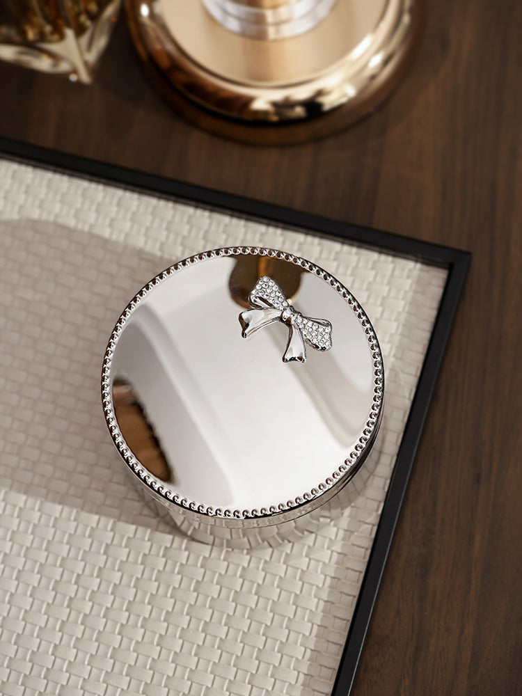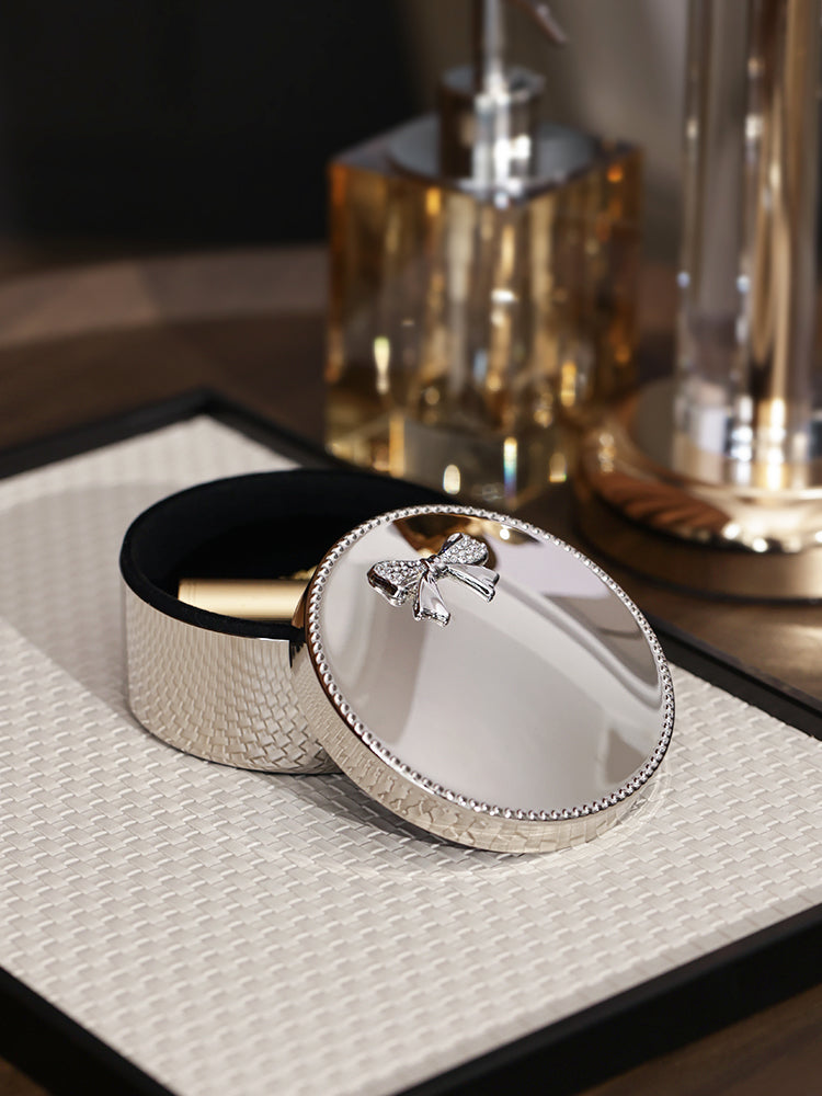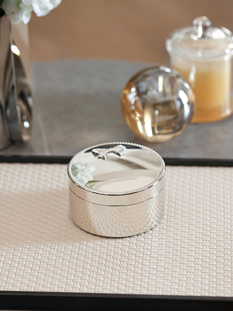 This Bow Trinket Box is a charming addition to any vanity. Made with delicate craftsmanship, it features a beautiful bow motif design that adds a touch of elegance to any room. The perfect size for storing small jewelry or keepsakes, this trinket box is both stylish and functional.