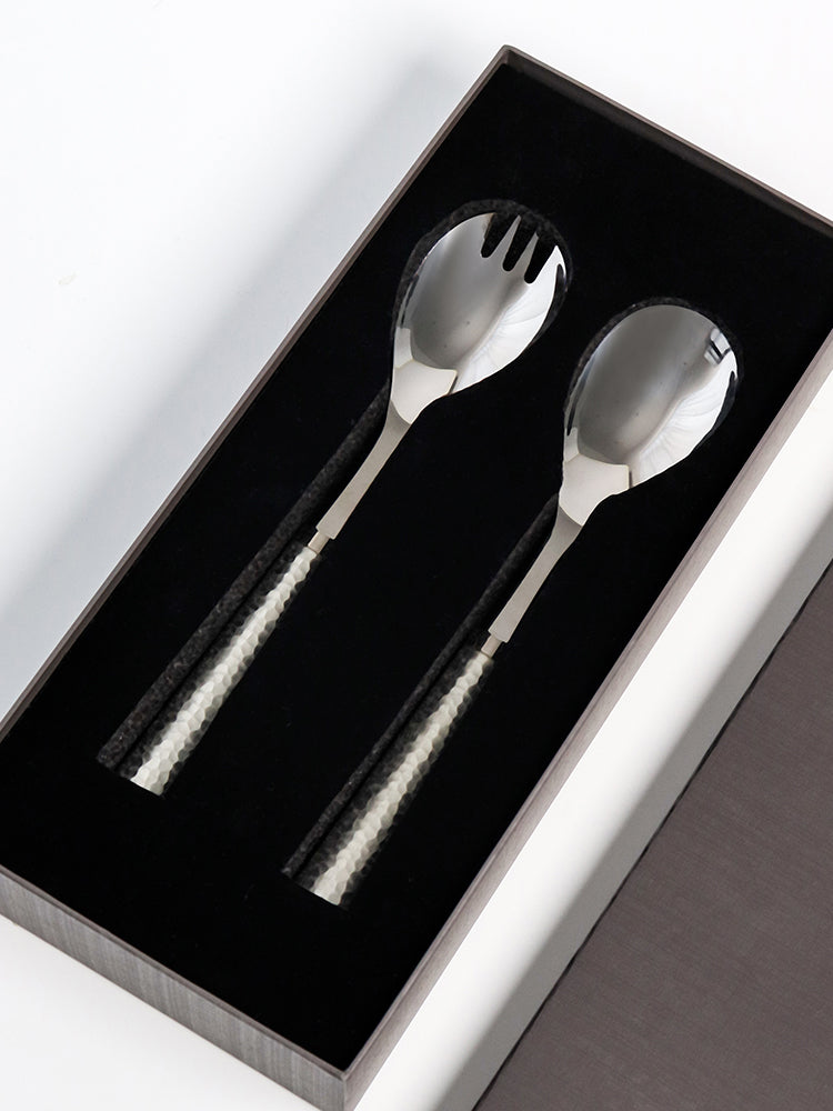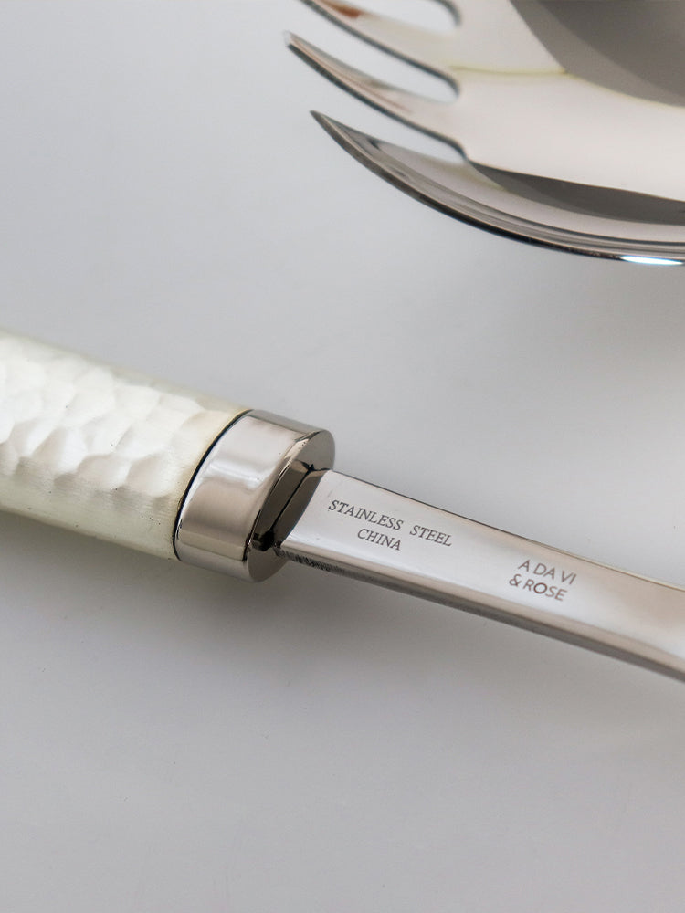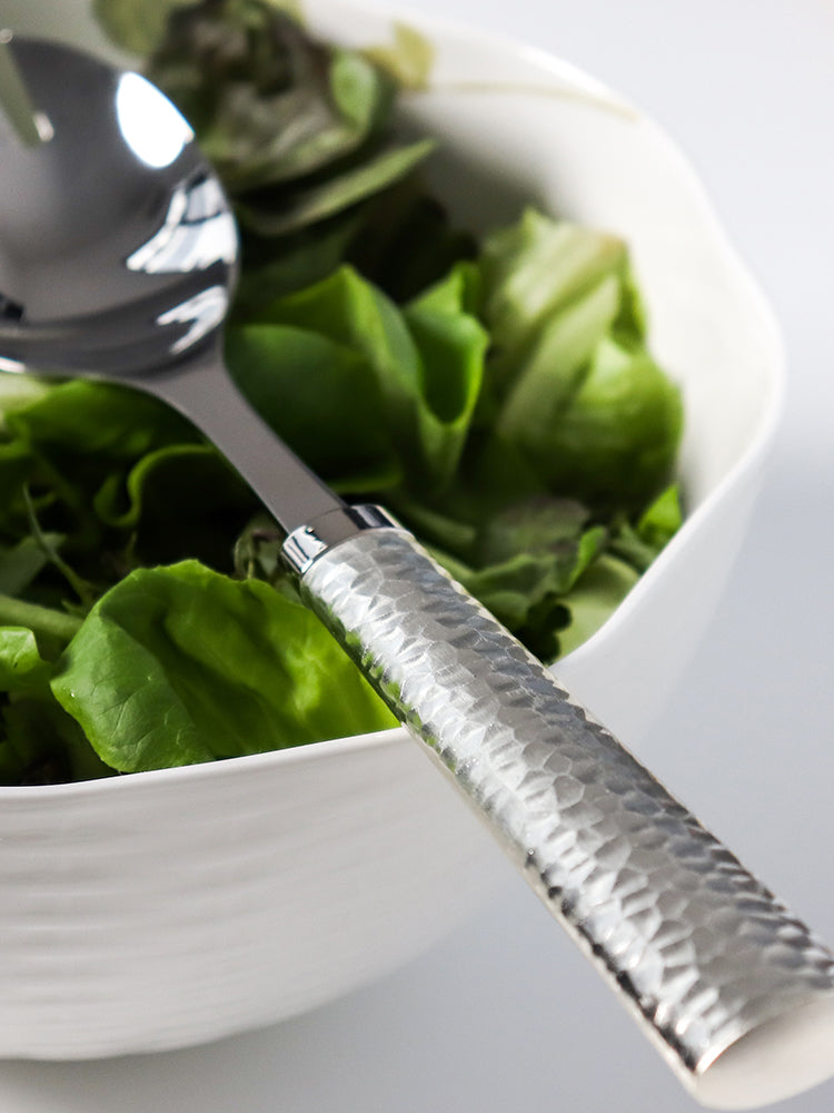 Add a sophisticated touch to your dining experience with our Modern Hammered Salad Server. The hammered design adds a unique texture to your serving pieces, making every meal feel special. Elevate your salads and impress your guests with this stylish and functional addition to your table.