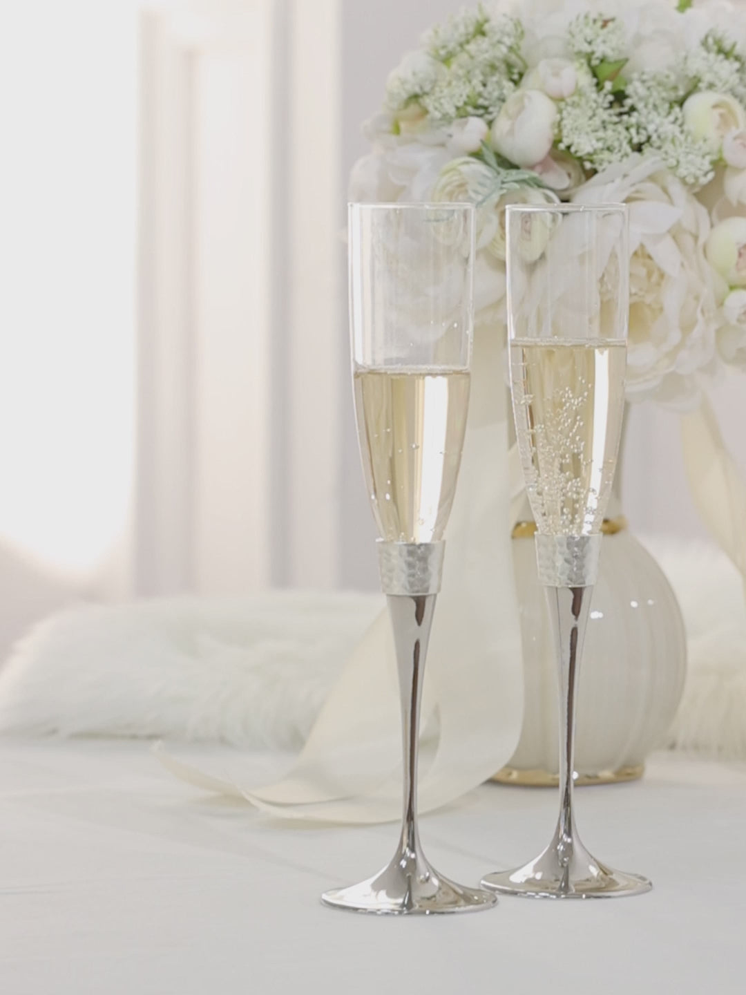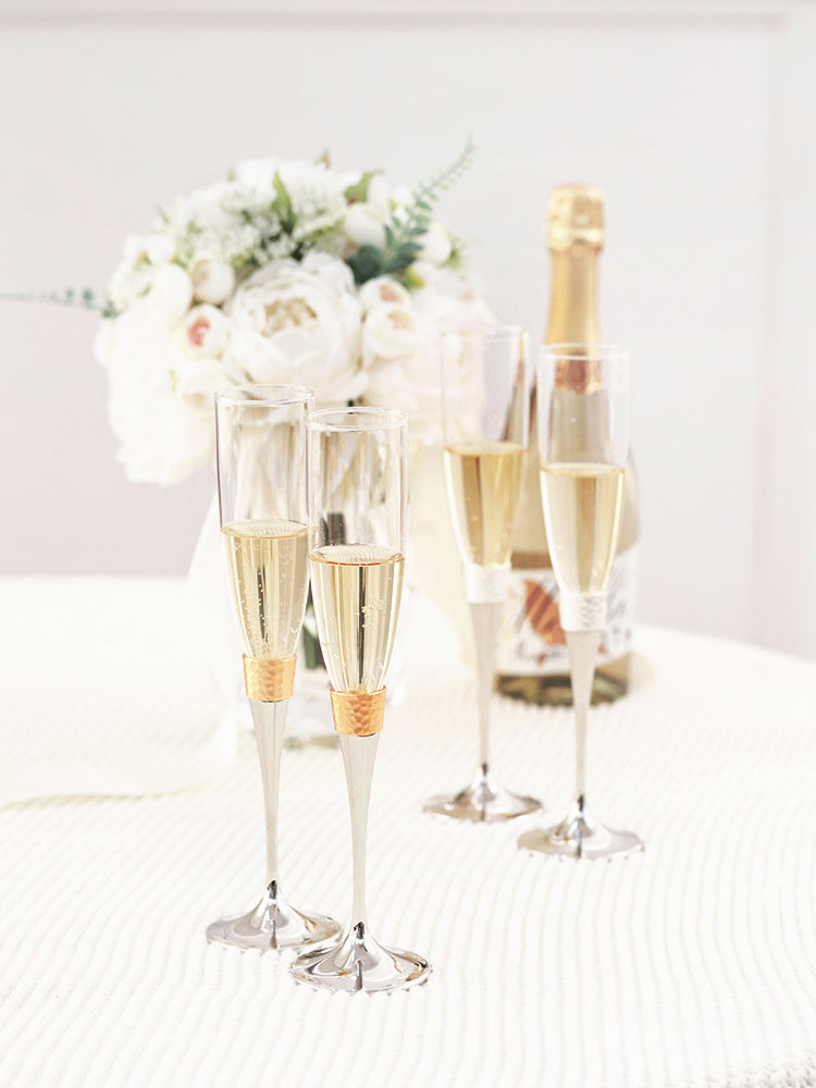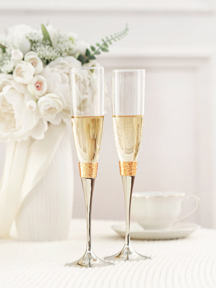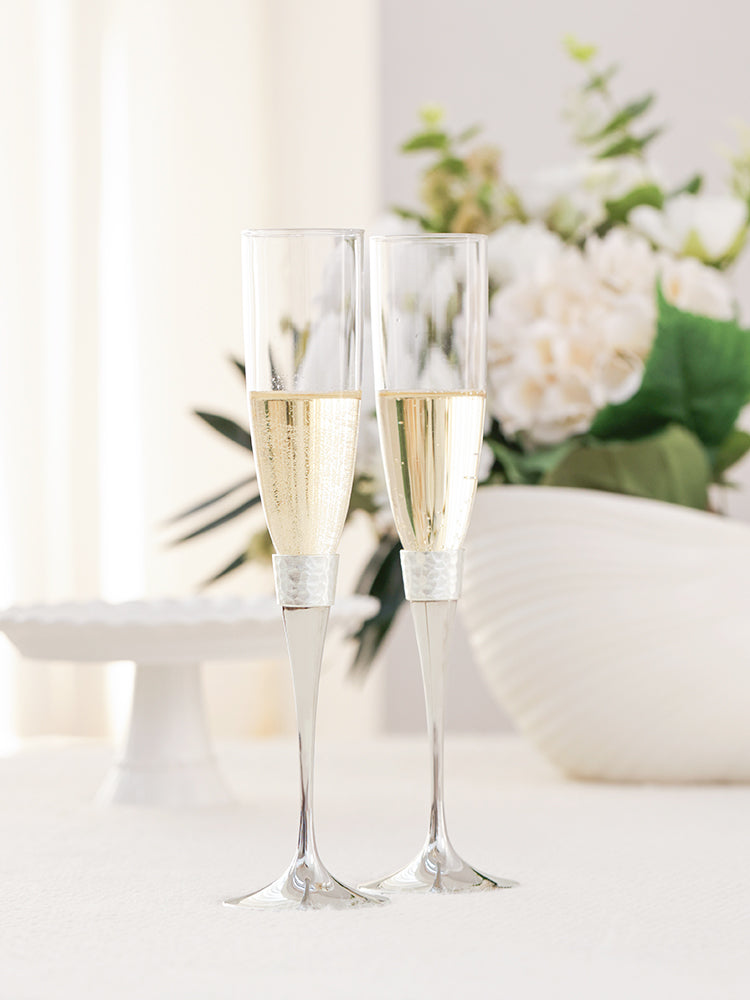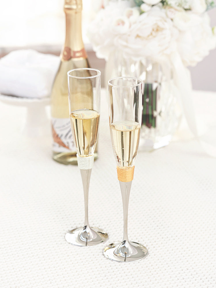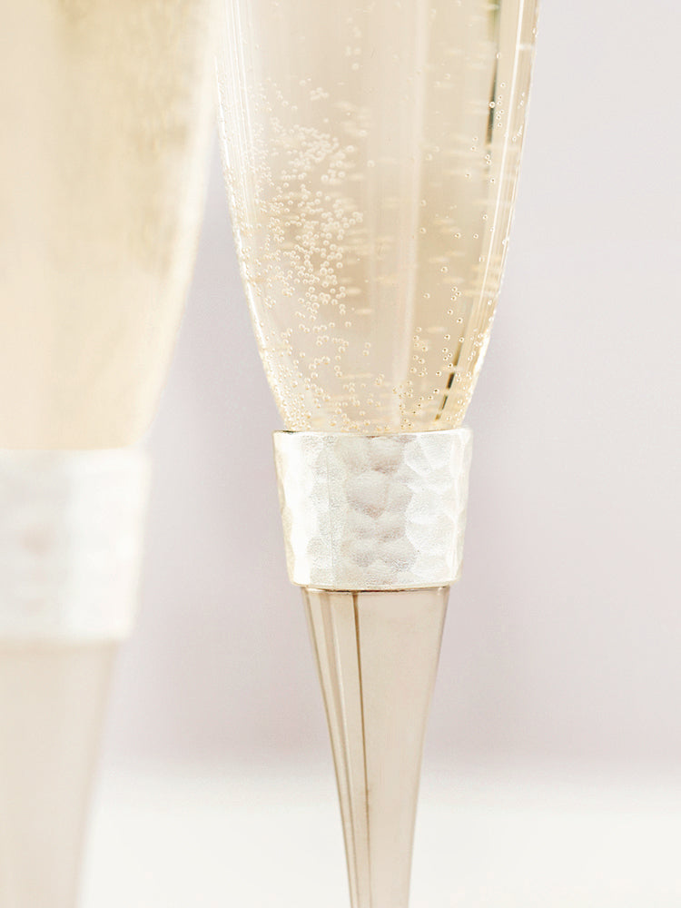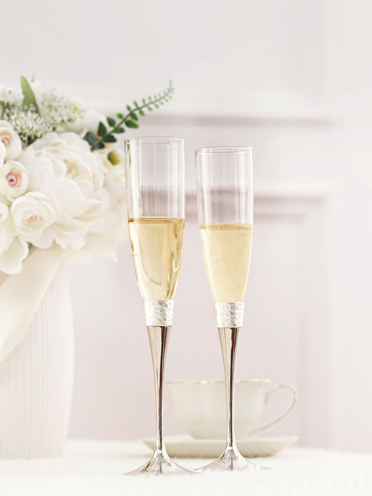 Elevate your toast with the Modern Hammered Toasting Flute Pair. The unique hammered design adds a touch of modern elegance to your wedding celebration. Made of high- quality materials, they pair seamlessly with the matching Modern Hammered Cake Server Set, creating a cohesive look for your occasion. Celebrate in style with this beautifully designed set, ideal for gifting or cherishing yourself.
